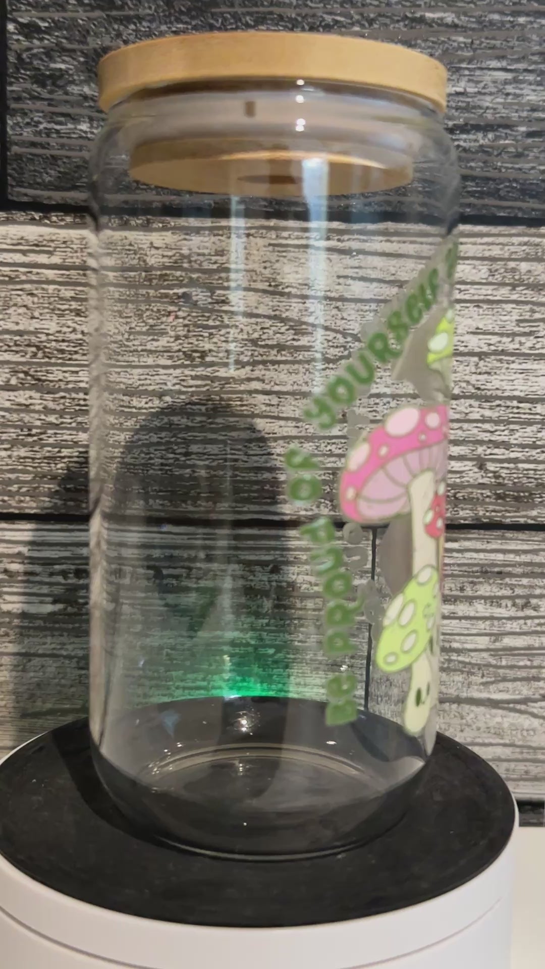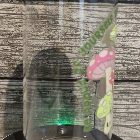 Be proud of yourself and everything that you are. This colorful 16oz Libby glass brings the encouragement you didn’t know you needed—plus a full field of funky, retro mushrooms. It’s the perfect cup for iced coffee, tea, or self-love on tap. Handmade in-house with premium UVDTF, bamboo lid and straw included.