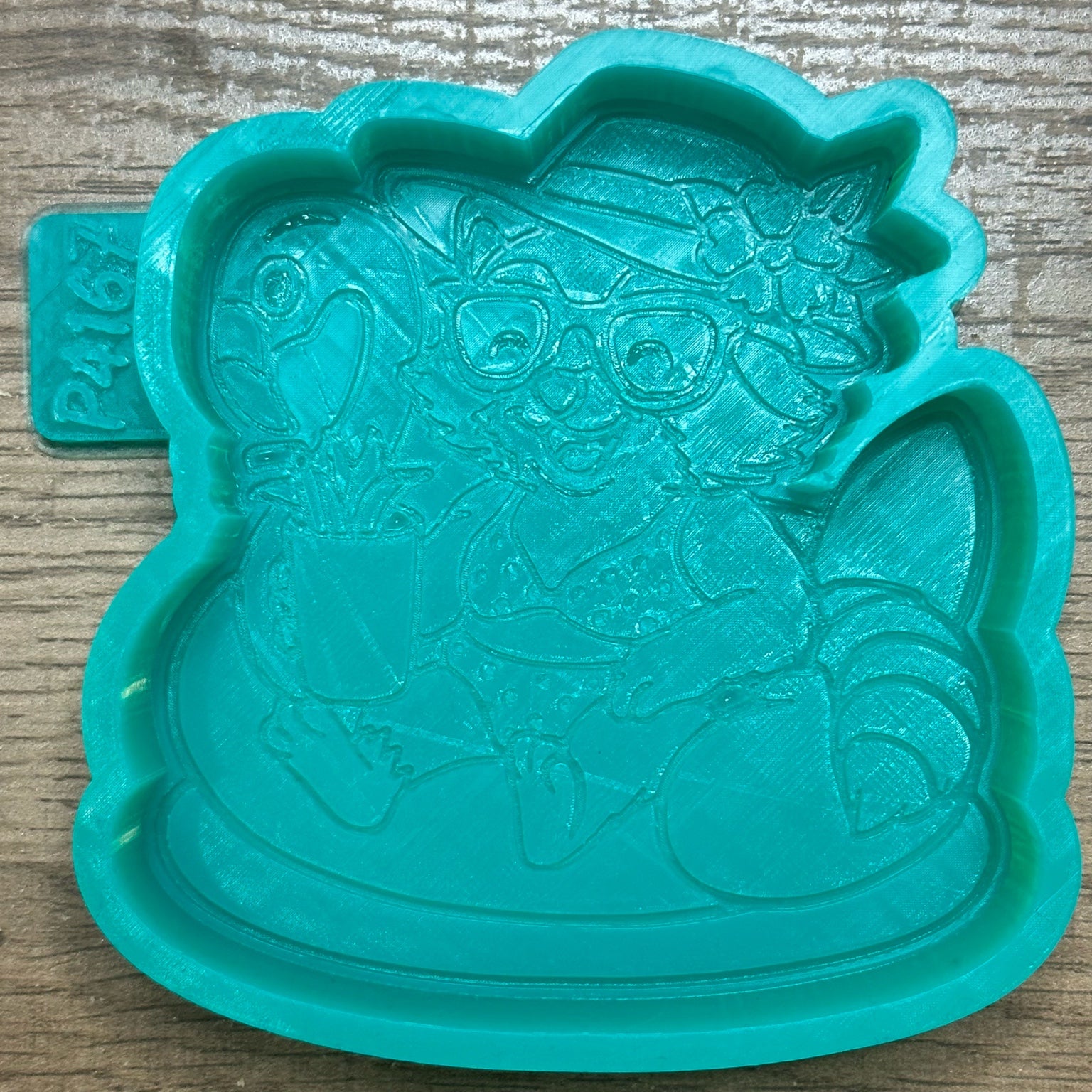 This fun and detailed mold features a raccoon relaxing on a floaty with a tropical drink and sunhat — perfect for summer car scents, gifts, and seasonal collections.