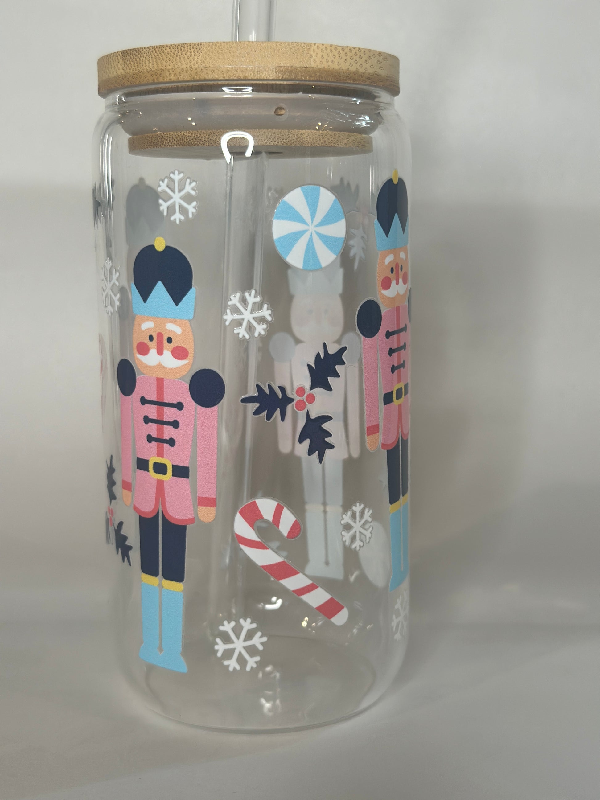 Nutcracker Christmas Libby Glass with Bamboo Lid & Straw – 16oz Holiday Tumbler